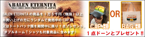 Balen Eternita 商品を1万5千円(税抜)以上 お買い上げの方にランダムで発売中のCAP類 又はトートバック類を期間中に限り1点プレゼントしちゃいます!!(今回のWネームTシャツも対象商品に含みます)
